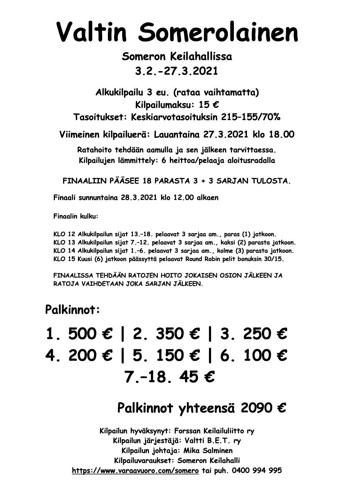 1.Samu Valaranta 740, 2.Jaakko Rantala 689, 3.Harri Paikkari 655, 4.Olli Hirvonen 654, 5.Mika Salminen 636. Pois Paavo Grönmark.
